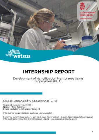 Tolsma, Marij (2025) INTERNSHIP REPORT Development of Nanofiltration Membranes Using Biopolymers (PHA). Internship report thesis, Global Responsibility & Leadership (GRL).
